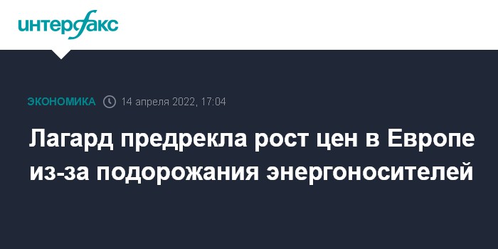 Москва. 14 апреля. INTERFAX.RU - Председатель ЕЦБ Кристин Лагард отметила растущий риск ускорения инфляции, особенно в краткосрочной перспективе, из-за скачка цен на энергоносители в условиях российско-украинского кризиса. По ее словам, цены на энергоресурсы в регионе на 45% выше, чем они были год назад.