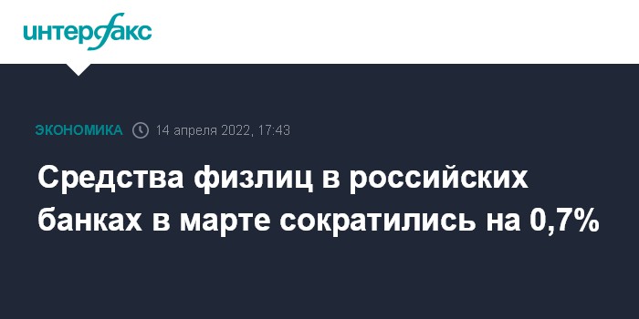 Москва. 14 апреля. INTERFAX.RU - Физлица к началу апреля заместили часть оттока рублевых средств, которые сняли с банковских счетов в конце февраля, в том числе за счет конвертации валюты, говорится в обзоре рисков финансовых рынков ЦБ; по данным регулятора, в целом за март средства физлиц в банковском секторе сократились на 0,7%.