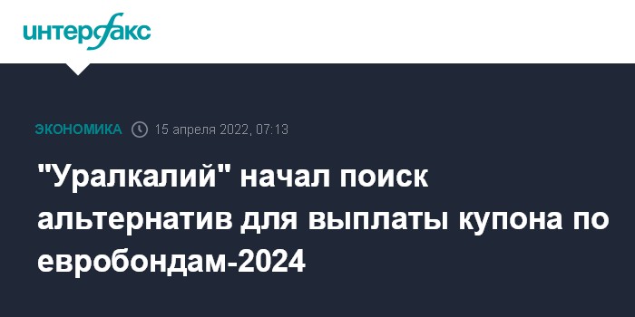 Москва. 15 апреля. INTERFAX.RU - "Уралкалий", которому 22 апреля предстоит купонный платеж по долларовым еврооблигациям с погашением в 2024 году, ищет альтернативные возможности для выплат на фоне общей неопределенности с проведением платежей российских заемщиков, сообщила компания.