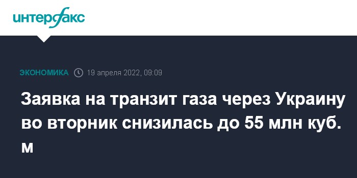 Как свидетельствуют данные "Оператора ГТС Украины", номинация на прокачку российского газа в регион на 19 апреля составляет 54,8 млн куб. м, заявка на 18 апреля была 56,9 млн куб. м.