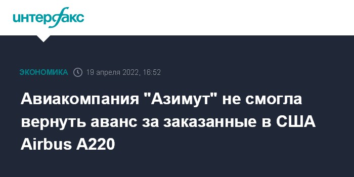 Москва. 19 апреля. INTERFAX.RU - Авиакомпания "Азимут" не смогла вернуть авансовые платежи за самолеты Airbus A220-300, заказанные у американского лизингодателя Air Lease Corporation.