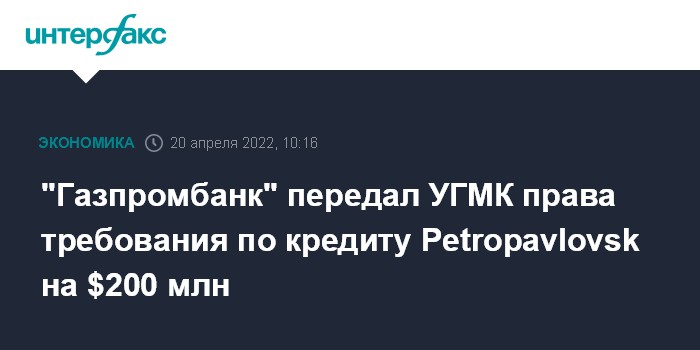 Москва. 20 апреля. INTERFAX.RU - Газпромбанк передал "Уральской горно-металлургической компании" (УГМК) права требования по кредиту Petropavlovsk на $200 млн, следует из сообщения золотодобытчика.