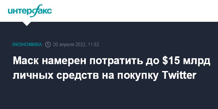 Москва. 20 апреля. INTERFAX.RU - Американский миллиардер, самый состоятельный человек в мире по версии Forbes, Илон Маск намерен потратить от $10 млрд до $15 млрд личных средств на покупку Twitter Inc., сообщили информированные источники The New York Post.
