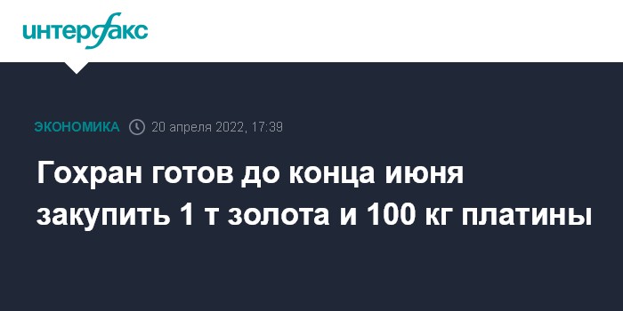 Москва. 20 апреля. INTERFAX.RU - Гохран сообщил, что готов закупить в Госфонд 1 тонну золота и 100 кг платины в стандартных слитках в срок до конца июня.