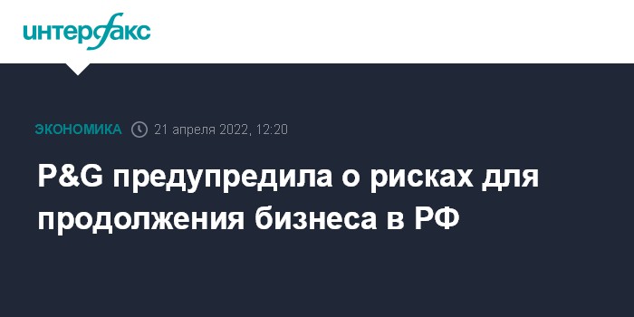Москва. 21 апреля. INTERFAX.RU - Американская Procter & Gamble Co (P&G), крупнейший в мире производитель потребительских товаров, предупредила о рисках для продолжения бизнеса в России из-за санкций и других ограничений.