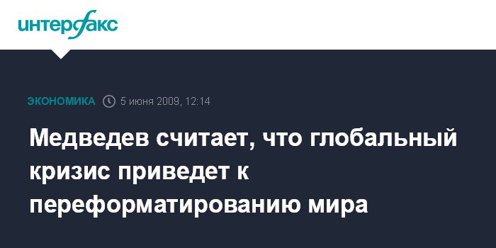 Москва. 5 июня. INTERFAX.RU - Президент РФ Дмитрий Медведев заявляет о том, что нынешний финансово-экономический кризис изменит мир, приведет к смене экономических лидеров и моделей поведения. Выступая в Петербурге на Международном экономическом форуме, он отметил, что нынешний кризис, несомненно, приведет к переформатированию мира.