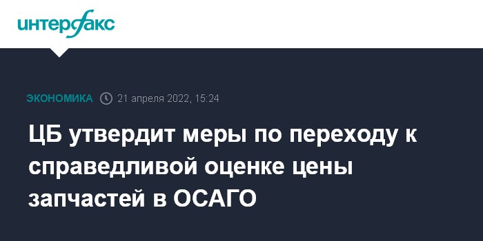 Москва. 21 апреля. INTERFAX.RU - Банк России скоро планирует утвердить меры по переходу к справедливой оценке стоимости запчастей в ОСАГО в связи с дефицитом запчастей, сообщил директор департамента страхового рынка Филипп Габуния, отвечая на вопросы депутатов в Госдуме.