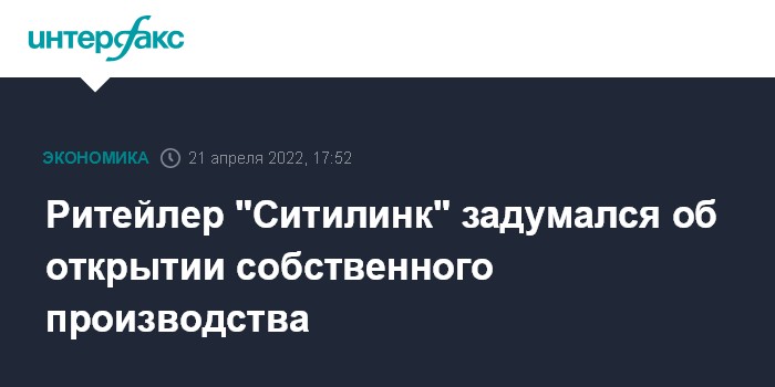 Москва. 21 апреля. INTERFAX.RU - Ритейлер "Ситилинк", специализирующийся на электронике и бытовой технике, планирует наладить собственное производство товаров, сообщил генеральный директор компании Михаил Славинский.