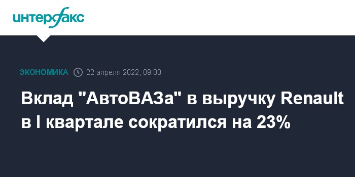 Москва. 22 апреля. INTERFAX.RU - Вклад АО "АвтоВАЗ" в общий показатель выручки французского автопроизводителя Renault по итогам I квартала 2022 года составил 527 млн евро, что на 23% меньше, чем годом ранее, говорится в отчете Renault.