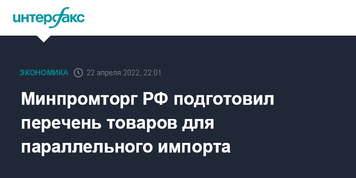 Москва. 22 апреля. INTERFAX.RU - Минпромторг РФ подготовил перечень товаров, в отношении которых будет разрешен так называемый параллельный импорт (позволяет ввозить в страну без разрешения правообладателя товар, продажа которого началась в других странах мира).