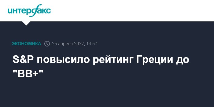 Москва. 25 апреля. INTERFAX.RU - Рейтинговое агентство S&P Global Ratings повысило долгосрочный рейтинг Греции до "BB+" с "BB", прогноз по рейтингу - "стабильный".