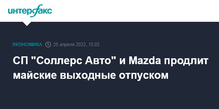 Москва. 25 апреля. INTERFAX.RU - Совместное предприятие российской автомобилестроительной группы "Соллерс Авто" и японской Mazda во Владивостоке (ООО "Мазда Соллерс Мануфэкчуринг Рус", МСМР) объявит корпоративный отпуск на девять рабочих дней: с 4 по 6 и с 11 по 18 мая, сообщили "Интерфаксу" в пресс-службе "Соллерс Авто".