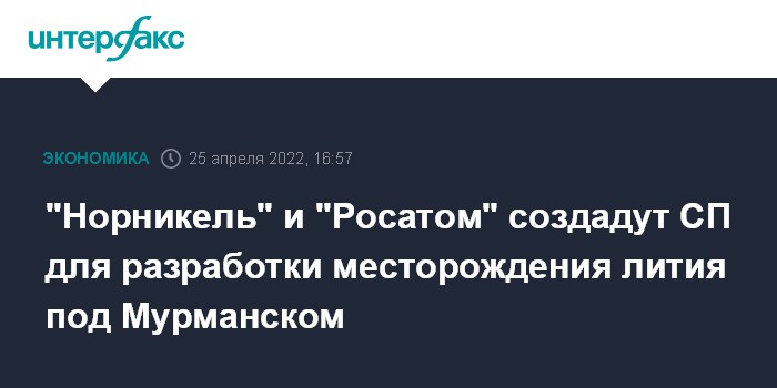 Москва. 25 апреля. INTERFAX.RU - "Росатом" и "Норникель" заключили соглашение, предполагающее реализацию совместных проектов по освоению литиевого месторождения Колмозерское в Мурманской области и дальнейшей глубокой переработке литиевого сырья, сообщил "Росатом".