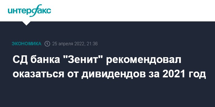 Москва. 25 апреля. INTERFAX.RU - Совет директоров банка "Зенит" рекомендовал акционерам не выплачивать дивиденды по итогам 2021 года, следует из сообщения кредитной организации.
