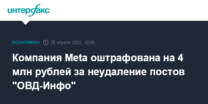 Компания Meta оштрафована на 4 млн рублей за неудаление постов "ОВД-Инфо"