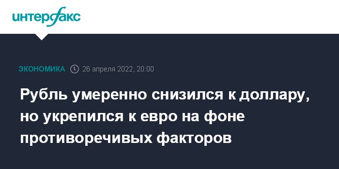 По мнению экспертов "Интерфакс-ЦЭА", рост курса рубля к доллару и евро в первой половине торгов 26 апреля был обусловлен как превышением предложения валюты на внутреннем рынке над спросом на нее в условиях сильного торгового сальдо, так ростом нефтяных цен. Кроме того, поддержку нацвалюте оказывали сообщения относительно возможности оплаты поставок газа в европейские страны в рублях, не нарушая санкции. Вместе с тем нестабильная конъюнктура мировых рынков капитала, в частности, падение американских фондовых индексов на 2-3% в первые часы торгов, в целом ухудшила отношение инвесторов к рисовым активам. На этом фоне на мировом рынке активизировался спрос на доллар США, курс которого вырос практически ко всем мировым валютам, и американские гособлигации, как активы "тихой гавани".