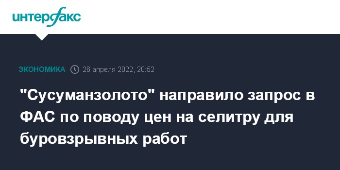 Москва. 26 апреля. INTERFAX.RU - Холдинг "Сусуманзолото" направил запрос в ФАС по поводу цен на аммиачную селитру, говорится в материалах золотодобытчика.