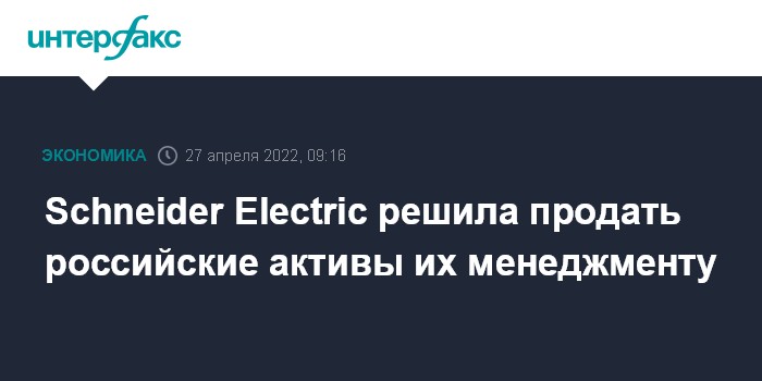 Москва. 27 апреля. INTERFAX.RU - Французская Schneider Electric объявила, что намерена продать свои российские активы местному руководству, согласовав сделку с местными властями.