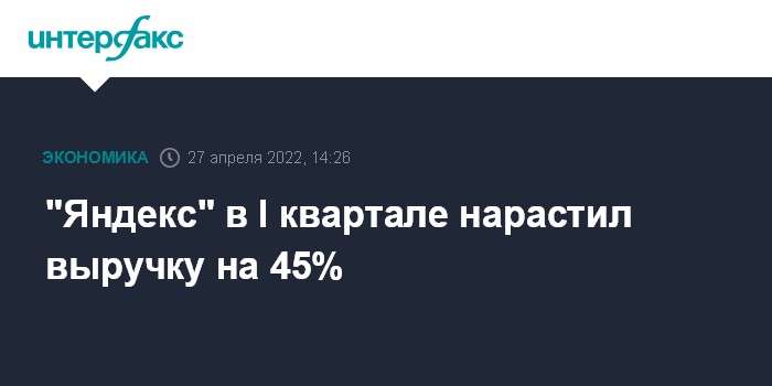 Москва. 27 апреля. INTERFAX.RU - Консолидированная выручка "Яндекса" по US GAAP в I квартале 2022 года выросла на 45% по сравнению с аналогичным периодом прошлого года и составила 106 млрд рублей, говорится в сообщении компании.