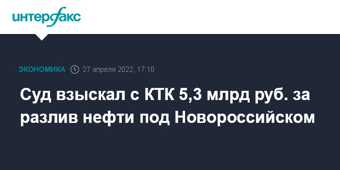 25 февраля Росприроднадзор направил в суд иск о взыскании с КТК 5,285 млрд рублей ущерба водному объекту от инцидента. Заявленная в нем сумма превосходит названную ведомством в октябре - 4,48 млрд рублей, которую консорциум призывал пересмотреть. По мнению компании, использованную методику расчета некорректно применять в отношении технологии погрузки нефти на танкер, предполагающей использование 5-километрового участка подводного нефтепровода.