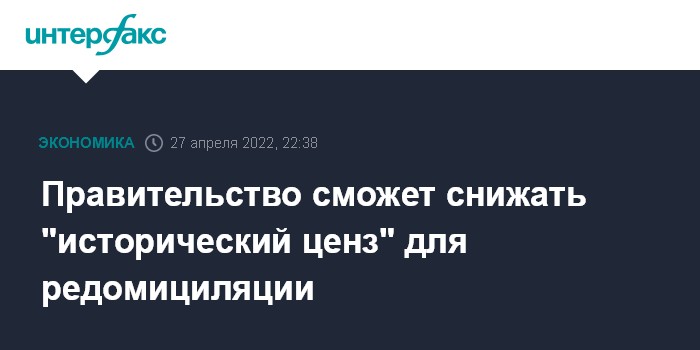 Москва. 27 апреля. INTERFAX.RU - Правительство может получить полномочия смягчать требования к дате создания компаний-кандидатов на редомициляцию в российские специальные административные районы (САР), следует из доработанного законопроекта, сообщил знакомый с ним источник "Интерфакса". Сейчас этот "исторический ценз" зафиксирован на уровне закона.