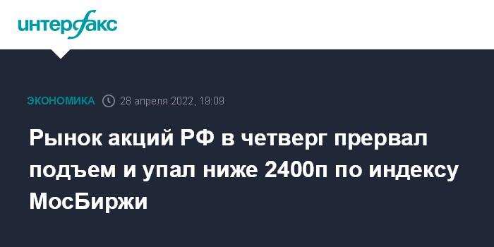 Рынок акций РФ в четверг прервал подъем и упал ниже 2400п по индексу МосБиржи