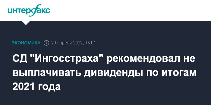 Москва. 29 апреля. INTERFAX.RU - Совет директоров "Ингосстраха" рекомендовал годовому собранию акционеров оставить чистую прибыль за 2021 год в распоряжении компании, не выплачивать дивиденды по итогам 2021 года, говорится в сообщении страховщика.
