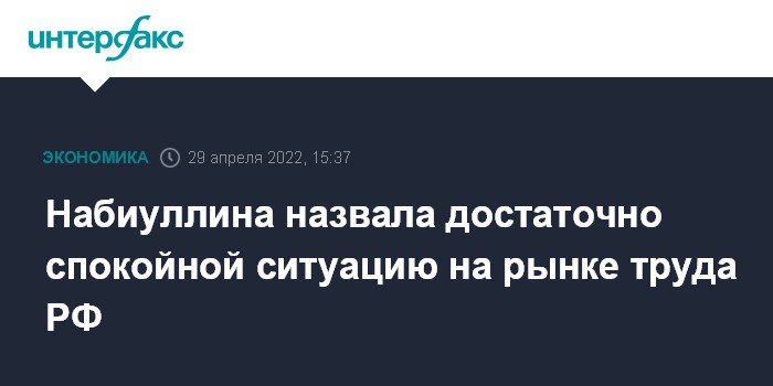 Москва. 29 апреля. INTERFAX.RU - Ситуация на рынке труда РФ достаточно спокойная, подстройка идет через вынужденные отпуска и неполный рабочий день, заявила глава ЦБ Эльвира Набиуллина на брифинге в пятницу.