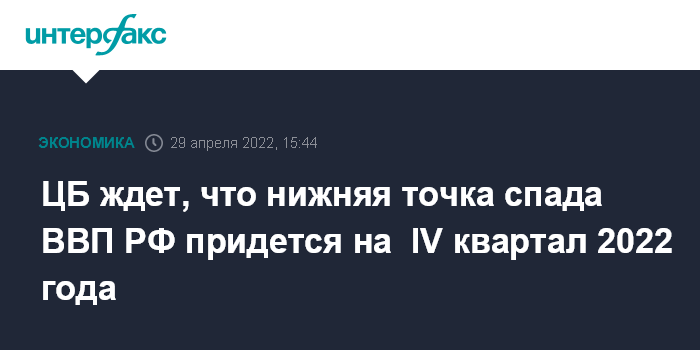 Москва. 29 апреля. INTERFAX.RU - Нижняя точка спада экономики РФ придется на IV квартал 2022 года, заявила глава ЦБ Эльвира Набиуллина на брифинге в пятницу.