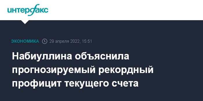 Москва. 29 апреля. INTERFAX.RU - Рекордный профицит текущего счета в размере $145 млрд, который прогнозируется в 2022 году, отражает неблагоприятную ситуацию с импортом, который быстро снижается, сказала на пресс-конференции председатель Банка России Эльвира Набиуллина.