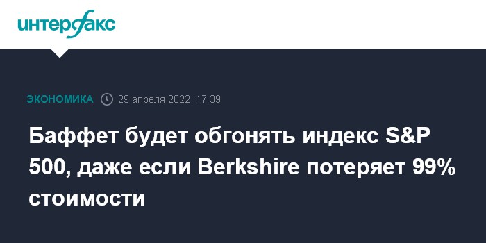 Москва. 29 апреля. INTERFAX.RU - Акции компании Уоррена Баффета Berkshire Hathaway будут опережать динамику индекса S&P 500 на отрезке с 1965 года, когда Баффет возглавил компанию, даже если потеряют 99% стоимости, показывают подсчеты издания Barron's.