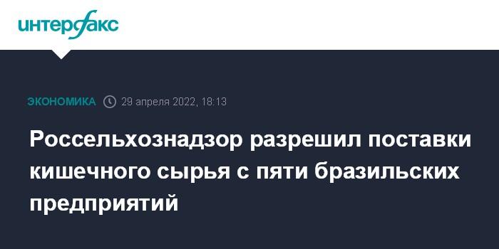 Москва. 29 апреля. INTERFAX.RU - Россельхознадзор с 29 апреля разрешил поставки кишечного сырья и кишечных оболочек с пяти бразильских предприятий Бразилии.