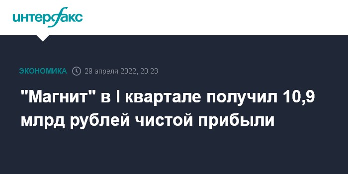 Москва. 29 апреля. INTERFAX.RU - Ритейлер "Магнит" в I квартале 2022 года получил 10,905 млрд чистой прибыли против 10,875 млрд годом ранее (показатели по стандарту IAS 17).