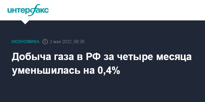Москва. 2 мая. INTERFAX.RU - Объем добычи газа в России в январе-апреле 2022 года уменьшился на 0,4% по сравнению с аналогичным периодом 2021 года и составил 261,42 млрд куб. м, свидетельствует оперативная сводка ЦДУ ТЭК.