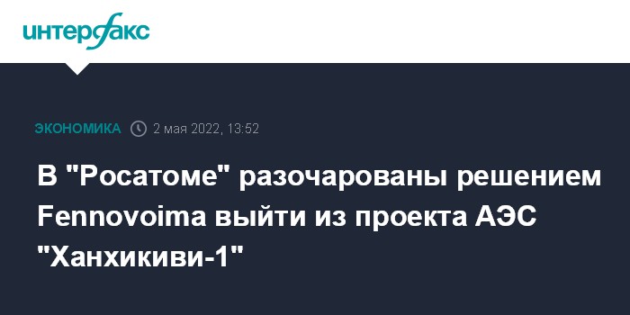 Финская Fennovoima утром 2 мая объявила о расторжении контракта с "Росатомом" на строительство АЭС "Ханхикиви-1" из-за значительных задержек и невозможности выполнить контракт. В последние годы наблюдались значительные задержки в реализации проекта, а российская военная операция на Украине только усугубила риски для него, заявили в Fennovoima.