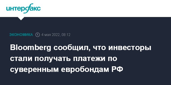 По данным источников агентства, основные международные клиринговые организации получили и обработали платежи по евробондам "Россия-2022" и "Россия-2042". Три анонимных держателя российских евробондов сообщили Bloomberg 3 мая, что их банки-депозитарии уже получили выплаты.