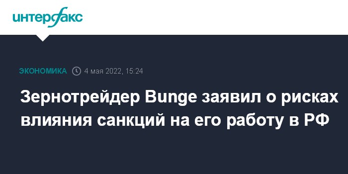 Москва. 4 мая. INTERFAX.RU - Компания Bunge, один из мировых зернотрейдеров, опасается влияния антироссийских санкций, вызванных спецоперацией на Украине, на свою работу в России.