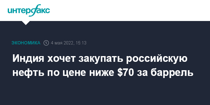 Москва. 4 мая. INTERFAX.RU - Индия ищет возможности закупать российскую нефть по цене ниже $70 за баррель, ведет переговоры об этом с Москвой, пишет The Economic Times со ссылкой на источники. По их сведениям, так власти Индии хотят компенсировать риски, связанные с санкционными ограничениями.