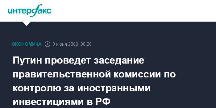 Москва. 8 июня. ИНТЕРФАКС - Очередное заседание правительственной комиссии по контролю за осуществлением иностранных инвестиций в России состоится в понедельник, 8 июня, сообщает пресс-службы российского кабинета министров.