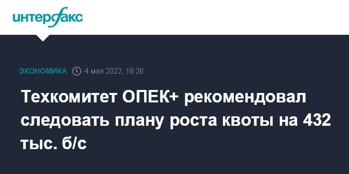 Москва. 4 мая. INTERFAX.RU - Эксперты технического комитета ОПЕК+ рекомендовали придерживаться плана альянса по наращиванию в июне квоты добычи нефти на 432 тыс. баррелей в сутки, сообщили "Интерфаксу" источники, знакомые с ситуацией.