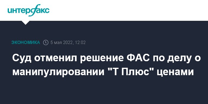 Москва. 5 мая. INTERFAX.RU - Арбитражный суд Москва признал незаконным и отменил решение и предписание ФАС России по делу о манипулировании ПАО "Т Плюс" ценами на энергорынке. Об этом говорится в решении суда, опубликованном в картотеке арбитражных дел.