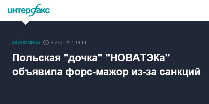 Москва. 9 мая. INTERFAX.RU - Польская дочерняя компания "НОВАТЭКа" - Novatek Green Energy c 25 апреля 2022 года объявила форс-мажор по своим обязательствам перед клиентами, говорится в обращении главы компании Дариуша Братоня (Dariusz Braton), размещенного на ее сайте.