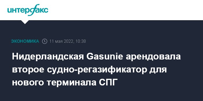 Москва. 11 мая. INTERFAX.RU - Нидерландская газотранспортная компания Gasunie законтрактовала уже вторую плавучую регазификационную установку для будущего терминала по приему СПГ в Эмсхавене в провинции Гронинген, задача которого – сократить зависимость от российского газа.