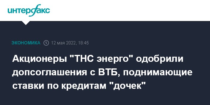 Москва. 12 мая. INTERFAX.RU - Акционеры ПАО "ГК "ТНС энерго" одобрили допсоглашения по займам "дочерних" компаний у банка ВТБ, которые поднимают максимальные ставки по кредитам, следует из сообщения группы.