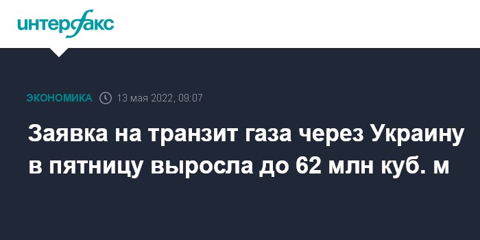 Москва. 13 мая. INTERFAX.RU - "Оператор ГТС Украины" принял от "Газпрома" заявку на транзит газа на пятницу в объеме 60 млн куб. м. Мощности заявлены только по одной из двух точек входа - газоизмерительной станции "Суджа". По коридору через ГИС "Сохрановка" заявка не принята.