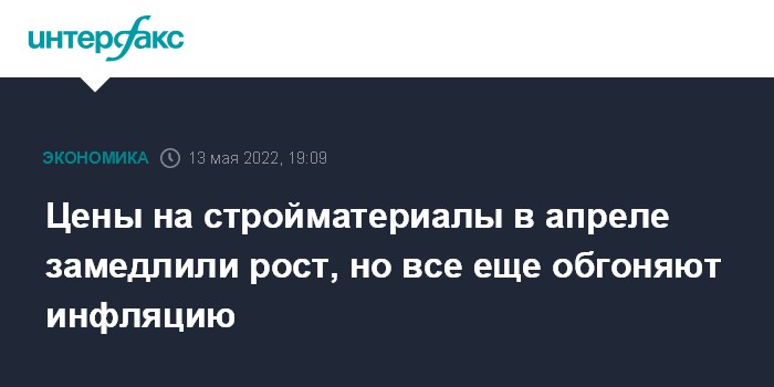 Москва. 13 мая. INTERFAX.RU - Цены на строительные материалы в РФ в апреле 2022 года выросли на 1,69% относительно предыдущего месяца после скачка на 9,95% в марте, повышения на 0,9% в феврале и роста на 0,46% в январе, следует из данных Росстата.