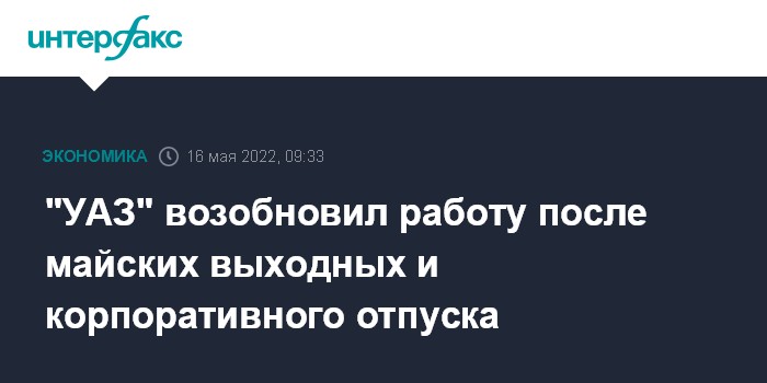 Москва. 16 мая. INTERFAX.RU - ООО "Ульяновский автомобильный завод" ("УАЗ", основной актив ПАО "Соллерс Авто") в понедельник возобновило работу после корпоративного отпуска и майских выходных, сообщили "Интерфаксу" в пресс-службе "УАЗа".