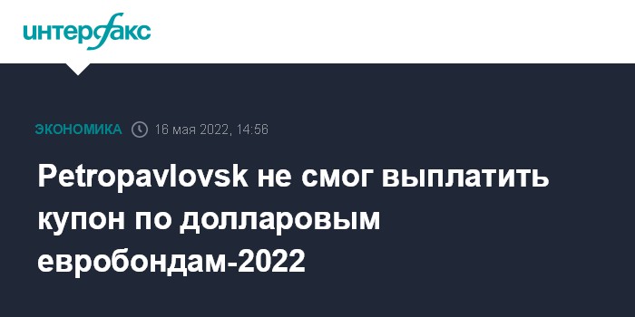 Москва. 16 мая. INTERFAX.RU - Золотодобывающая компания Petropavlovsk не смогла в срок выплатить купон по долларовым еврооблигациям с погашением в 2022 году, говорится в ее сообщении.
