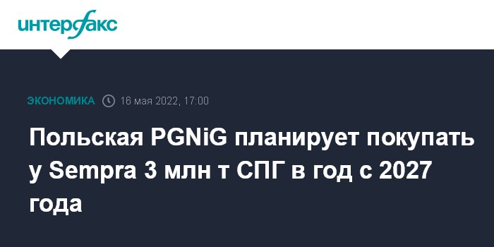 Москва. 16 мая. INTERFAX.RU - Sempra Infrastructure, дочерняя компания американской Sempra, и Польская нефтегазовая компания (PGNiG) определили основные условия соглашения о покупке около 3 млн т сжиженного природного газа (СПГ) на условиях free-on-board (FOB) из портфеля проектов СПГ Sempra Infrastructure в Северной Америке.