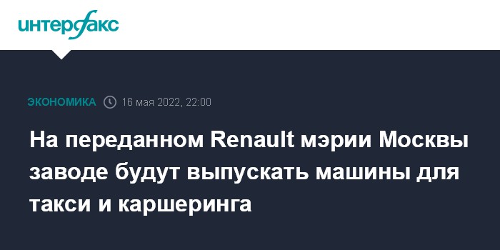 Москва. 16 мая. INTERFAX.RU - На Московском автомобильном заводе, который группа Renault передала мэрии города, планируют производить машины для такси и каршеринга, сообщили в столичном департаменте транспорта и развития дорожно-транспортной инфраструктуры.